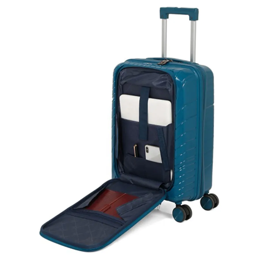 Blue textured hard cabin-sized trolley bag, secured with a number lock